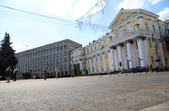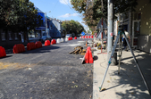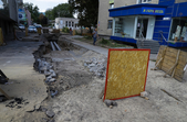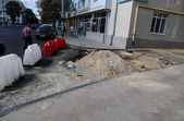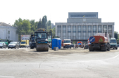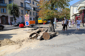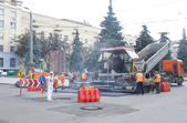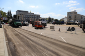 Поряд з майданом Соборним, біля фонтану демонтують тротуарну плитку, поруч перекладають труби, що ведуть у двір багатоповерхівок. А на самому майдані Соборному, який на час ремонту перетворився на місце відстою дорожньої техніки та тимчасового зберігання будівельних матеріалів, також частково зрізали асфальт.