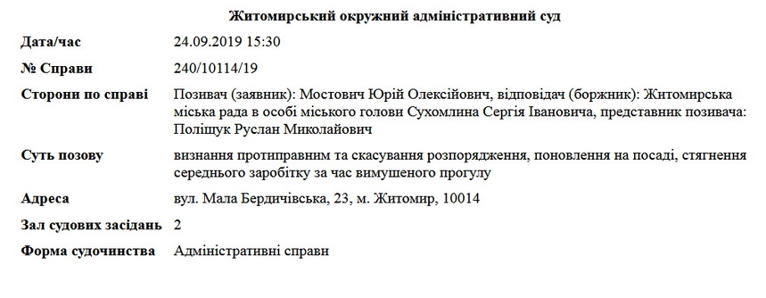 «22.08.2019 до Житомирського окружного адміністративного суду надійшла позовна заява ОСОБА_1 (Юрій Мостович – ред.), у якій він просить: визнати протиправним та скасувати розпорядження Житомирського міського голови №761 від 26.07.2019 про припинення служби в органах місцевого самоврядування та звільнення ОСОБА_1 з 29.07.2019 з посади начальника управління житлового господарства Житомирської міської ради; поновити ОСОБА_1 на посаді начальника управління житлового господарства Житомирської міської ради з 29.07.2019; стягнути з Житомирської міської ради на користь ОСОБА_1 середній заробіток за час вимушеного прогулу в період з 29.07.2019 по день постановлення судом судового рішення», - йдеться в ухвалі суду.