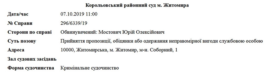 Водночас Корольовський районний суд м.Житомира на початку липня отримав затверджений обвинувальний акт в кримінальному провадженні по обвинуваченню Юрія Мостовича за ч.3 ст.368 КК України (Прийняття пропозиції, обіцянки або одержання неправомірної вигоди службовою особою). Покарання за цією статтею передбачає позбавленням волі на строк від 5 до 10 років з позбавленням права обіймати певні посади чи займатися певною діяльністю на строк до трьох років, з конфіскацією майна.