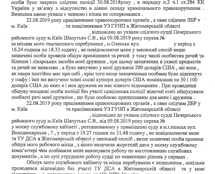 У серпні 2019 року будинок судді Олевського районного суду Житомирської області, якого разом з адвокатом та слідчою викрили у налагодженні незаконної схеми повернення бурштинокопачам вилученого в них обладнання, обшукали слідчі Державного бюро розслідувань. Такі слідчі дії в його будинку та службовому кабінеті обурили суддю і він поскаржився про це голові Вищої ради правосуддя.