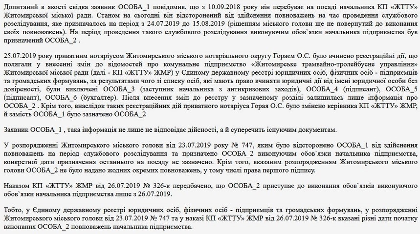 Богунський районний суд м.Житомира погодив слідчим доступ до документів комунального підприємства «Житомирське трамвайно-тролейбусне управління» та приватного нотаріуса Олега Горая в рамках розслідування справи про підробку документів (ч. 1 ст. 358 КК України).