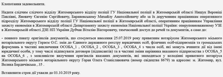 Також до 3 жовтня суд надав доступ до повного пакету оригіналів документів, що стосуються внесення 25.07.2019 року приватним нотаріусом Житомирського міського нотаріального округу Гораєм О.С. змін до Єдиного державного реєстру юридичних осіб, фізичних осіб-підприємців та громадських формувань.