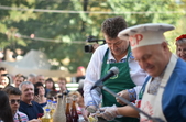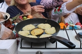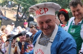 На фото видно, що Віталій Бунечко разом з мером Коростеня Володимиром Москаленком смажить деруни.