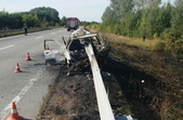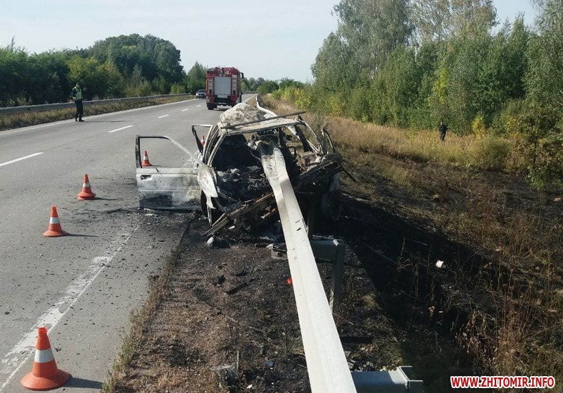 На 136-му кілометрі траси Київ – Ковель - Ягодин в Коростенському районі Житомирської області відбійник пронизав автомобіль Peugeot, який загорівся після удару, а водій дивом уцілів.
