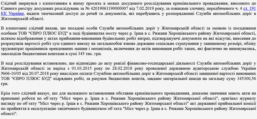 «У клопотанні слідчий вказав, що посадові особи Служби автомобільних доріг у Житомирській області за змовою із посадовими особами ТОВ "ЄВРО ПЛЮС БУД" в ході будівництва мосту через р. Ірша в с. Рижани Хорошівського району Житомирської області, шляхом відображення у актах приймання-виконання будівельних робіт витрат, підтверджуючі документи на які відсутні, внесення до розрахунків вартості робіт сум єдиного внеску на загальнообов`язкове державне соціальне страхування у завищеному розмірі, обліку трудовитрат працівників орендованих машин і механізмів, включення до актів виконання робіт таких, які фактично не виконувались, заволоділи бюджетними коштами в сумі 345 тис. грн», - йдеться в матеріалах суду.