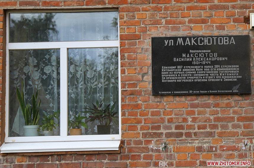 «Василь Максютов (1901 – 1944) – підполковник, командир 807 стрілецького полку 304 стрілецької Житомирської девізії. Полк під його командуванням один з перших, подолавши супротив гітлерівців, прорвався до північно-західної частини Житомира. За виявлені сміливість і мужність при звільненні Житомира нагороджений Орденом червоного прапора. Встановлено на честь 30-річчя перемоги у Великій Вітчизняній війні».