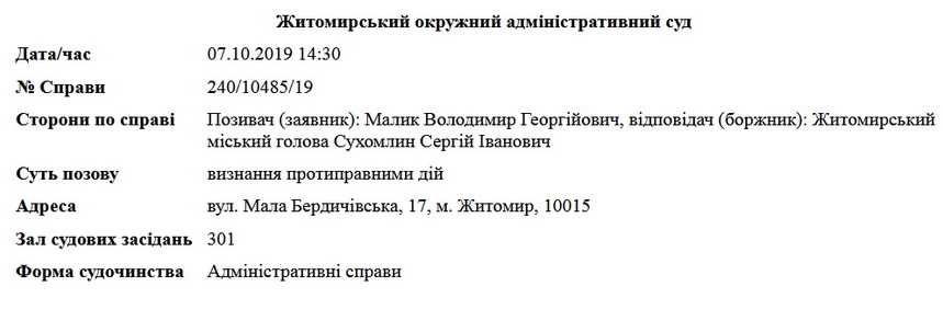 До Житомирського окружного адміністративного суду надійшов позов Володимира Малика до мера Сергія Сухомлина щодо визнання дій останнього протиправними.