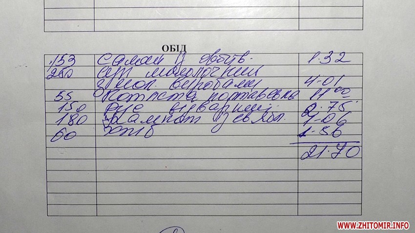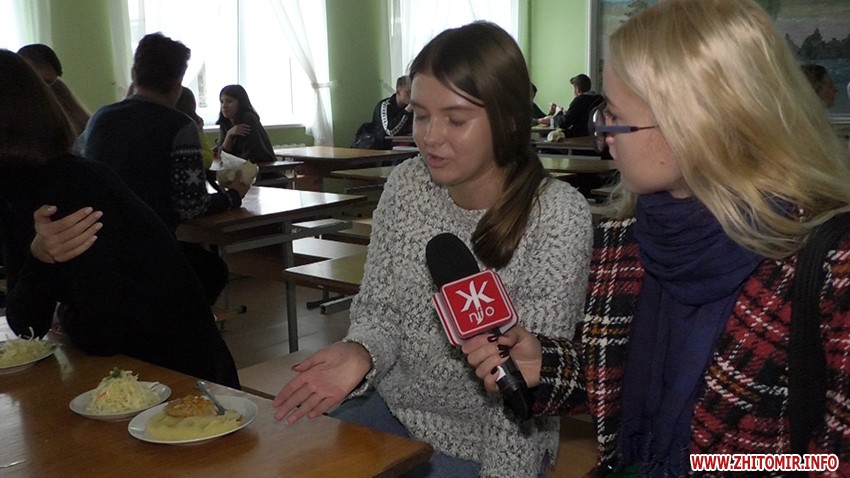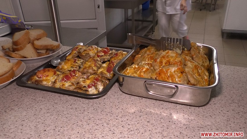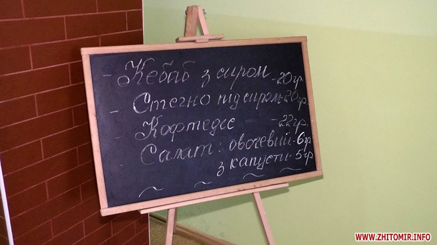Сьогодні на обід у ліцеї № 25 молочний суп, салат овочевий, картопля та котлета. Крім звичайного меню, є ще одне – на вибір. У його списку: кебаб з сиром, грецькі котлети з овочів та м’яса, стегно під сиропом та салат. Як розповідає директор ліцею, таким чином заклад намагається модернізувати систему харчування і надати учням альтернативу. Нові позиції у меню готують зі збірки рецептів українського кулінара Євгена Клопотенка, який минулоріч презентував її у Житомирі.