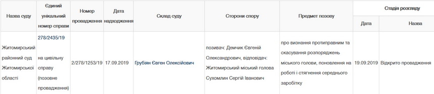 17 вересня 2019 року Житомирський районний суд отримав позов Демчика про визнання протиправним та скасування розпоряджень міського голови, поновлення на роботі і стягнення середнього заробітку.