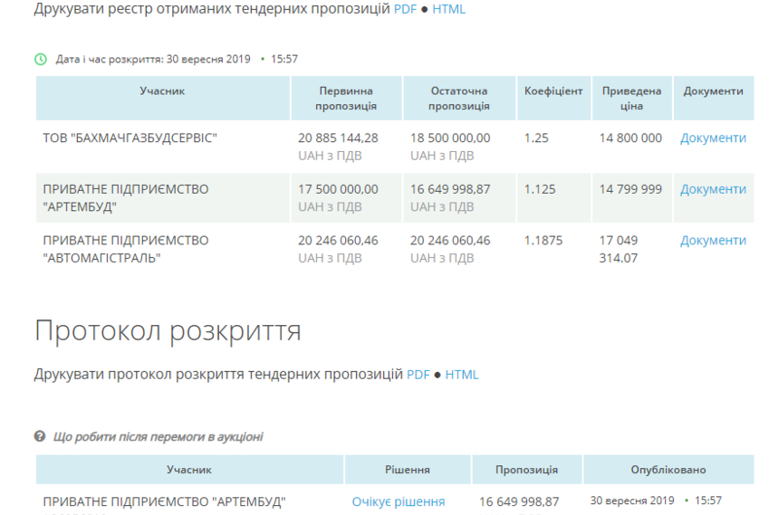 Про це йдеться в протоколі розкриття тендерних пропозицій від 30 вересня 2019, опублікованому на ресурсі ProZorro.