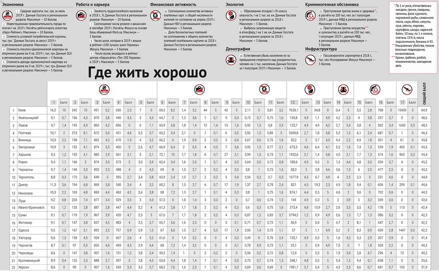«В этом году при подготовке традиционного рейтинга комфортности украинских городов Фокус предложил рассказать о них их жителям и уроженцам, которые, даже уехав в столицу, продолжают пристально следить за жизнью малой родины. В этих оценках много общего и для городов-миллионников, и для небольших областных центров. Часто звучат высказывания о том, что украинским городам не хватает чёткой стратегии развития, качество управления хромает, а коммуникация между администрациями и активными горожанами не налажена. Жители большинства регионов столкнулись с проблемой переизбытка личного автотранспорта на улицах: дорожная инфраструктура, большей частью отстроенная ещё в советские времена, не справляется с увеличением нагрузки. Также не хватает качественного транспортного сообщения, особенно аэропортов. Постоянно звучат жалобы и на то, что из-за чрезмерно активной и часто хаотичной застройки города теряют исторический облик, а из-за отсутствия интересной работы и достойной оплаты труда они остаются без главного – людей, которые уезжают в поисках лучшей доли», - пишет издание.