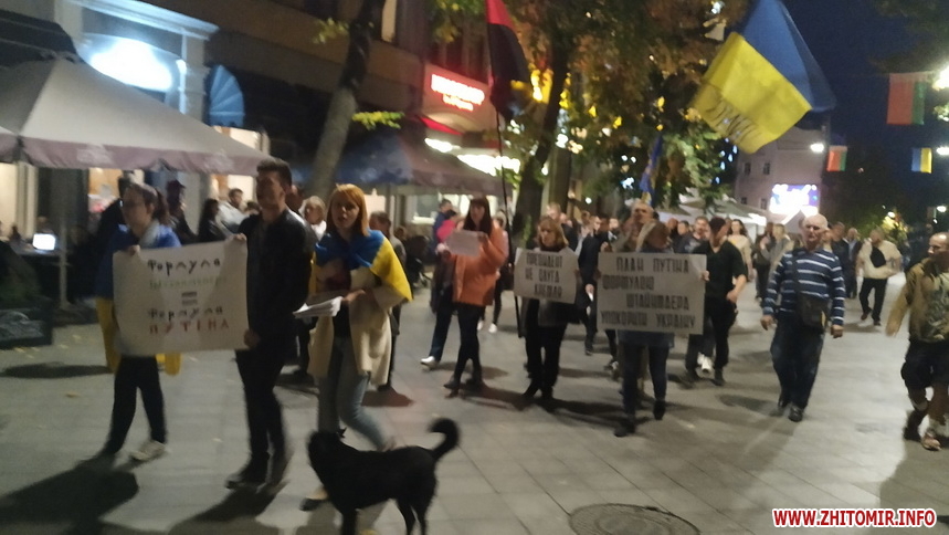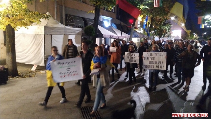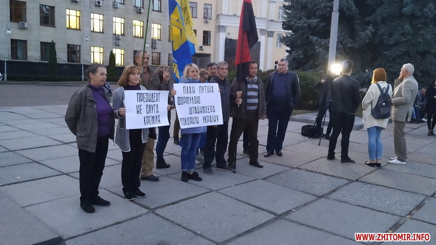 На акцію прийшли кілька десятків житомирян, які тримають в руках саморобні плакати: «Президент не слуга Кремля», «План Путіна формулою Штайнмаєра упокорити Україну». З майдану Корольова учасники акції з плакатами та прапорами пішли на пішохідну вулицю Михайлівську.