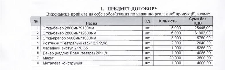 - договір на 81 тис. 978 грн на поставку рекламної продукції у кількості 41 шт.