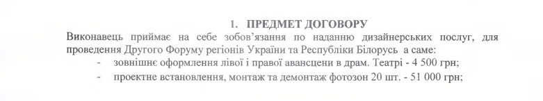 Управління культури та туризму Житомирської ОДА напередодні проведення Другого Форуму регіонів України та Республіки Білорусь уклало шість договорів на поставку лаків, рекламної продукції, прапорів, стрічок, фотозон та надання дизайнерських та інших послуг на загальну суму у понад 300 тис. грн.