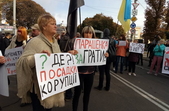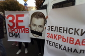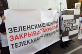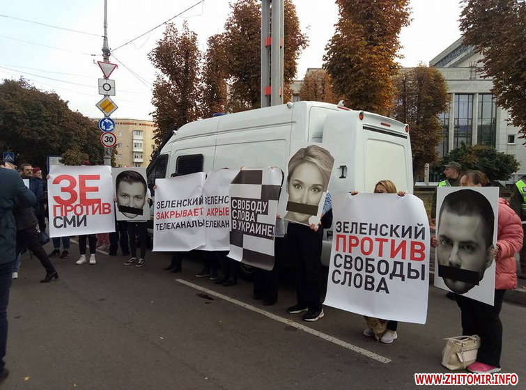 Противники «капітуляції» прийшли з плакатами, з якими вони проводили акцію у Житомирі 2 жовтня. Прихильники каналів NesOne, 112, ZIK, власником яких є народний депутат від «Опозиційної платформи – За життя» Тарас Козак, тримають плакати «Сводобу слова в Украине!», «Зеленский закрывает телеканалы», «Зе против СМИ».