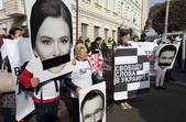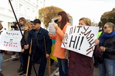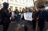 Учасники акцій з плакатами знаходяться на вулиці Леха Качинського, біля приміщення драмтеатру, де вранці почалося пленарне засідання в рамках Другого форуму регіонів України та Республіки Білорусь.