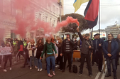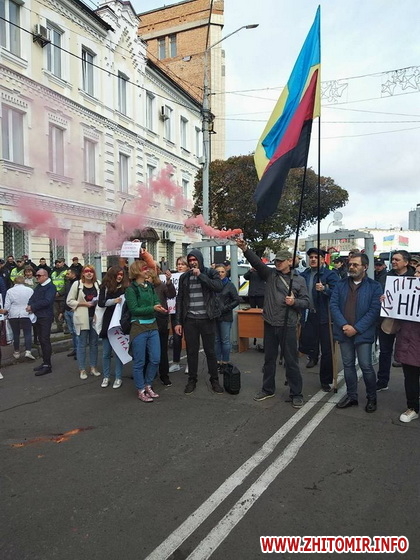 У Житомирі учасники акції протесту проти «формули Штайнмаєра», які 4 жовтня прийшли з плакатами на вул.Леха Качинського, під вигуки «Ні капітуляції» запалили фаєри.