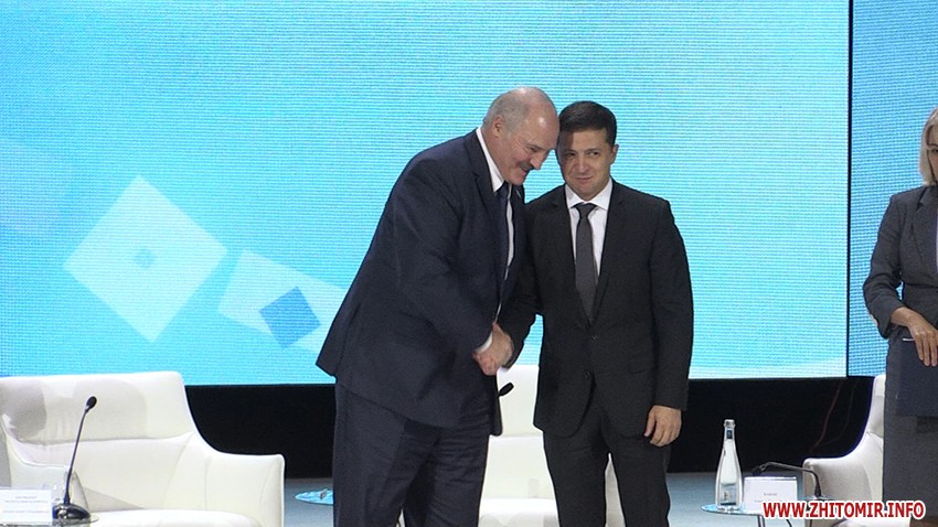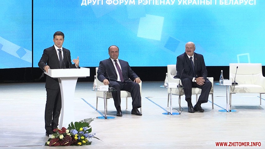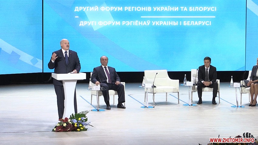 Президент України Володимир Зеленський та президент Республіки Білорусь Олександр Лукашенко взяли участь у пленарному засіданні Другого Форуму регіонів, яке проходило 4 жовтня в приміщенні Житомирського драмтеатру. Саме засідання розпочалось ще о 9:30 і до обіду, з кількома перервами на каву, свої доповіді зачитували представники різних областей та регіонів двох країн. Однак найбільш очікуваною була участь у форумі президентів України та Білорусі, які прибули до театру після 14-ї години.