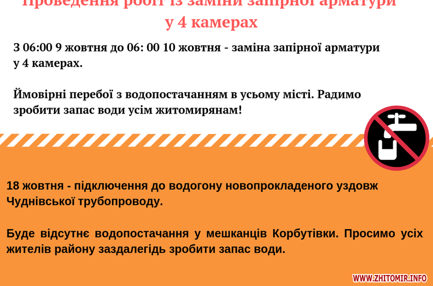 «З 06:00 9 жовтня до 06: 00 10 жовтня КП “Житомирводоканал” і підрядна організація проводитимуть масштабні роботи на водогоні міста. Працівники підприємства готуватимуться до заміни аварійної ділянки трубопроводу, що простягається уздовж вул. Чуднівська. Протягом доби буде замінено 5 засувок у трьох камерах, що знаходяться у цьому районі. У вищевказаний час підрядна організація проводитиме реконструкцію ще однієї камери, що знаходиться поблизу КП “Дитяча лікарня ім. В.Й.Башека”. Зверніть увагу, що унаслідок проведення робіт з 06:00 9 жовтня до 06:00 10 жовтня ймовірні перебої з водопостачанням в усьому місті. Ми радимо вам зробити запас води», - йдеться у повідомленні водоканалу від 3 жовтня.