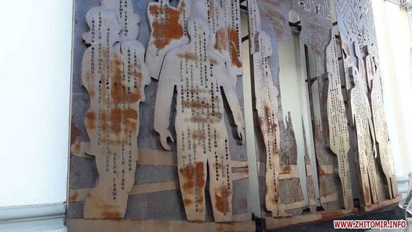 Пам’ятник Героям Небесної сотні, який офіційно відкрили 23 серпня 2017 року на майдані Корольова в Житомирі, через два роки вкрився корозійними плямами. Мова йде про сталевий триптих на фасаді будівлі Житомирської обласної ради.