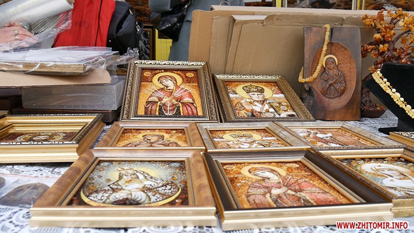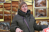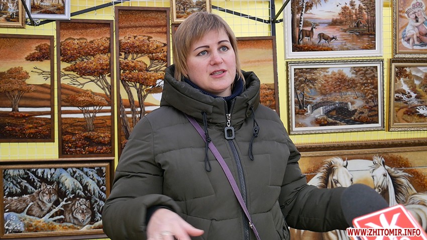 «Я з Рівненської області, представляю колекцію картин «Бурштиновий світ». Їжджу тільки по великих містах. Тут я вперше, мені дуже сподобалось ваше місто і оформлення. Ціни на картини у нас такі: 380 грн ікони, 350 грн природа і до 22 тис. грн картина з кіньми, це моя візитна картка», – розповідає продавчиня Алла.