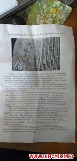 Як повідомляв Житомир.info, 23 березня 2019 року у Житомирі волонтери, а також батьки і дружини полеглих воїнів АТО відкрили творчу майстерню з виготовлення барельєфів «Ікона пам’яті загиблим за незалежність України».