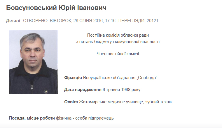 На сайті облради зазначено, що Юрій Бовсуновський – підприємець, його освіта – Житомирське медичне училище, зубний технік.