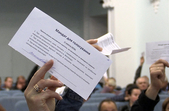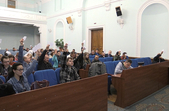 Після виступів, присутні взялися голосувати за перше питання – «Затвердження умов проведення конкурсу з перевезення пасажирів». Його майже одноголосно не підтримали.
