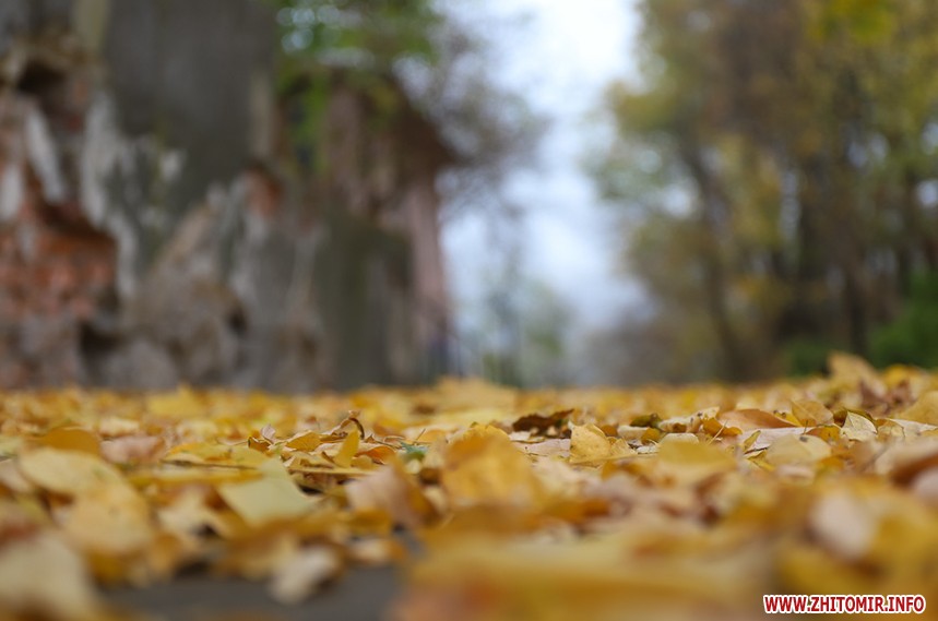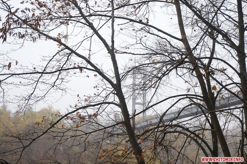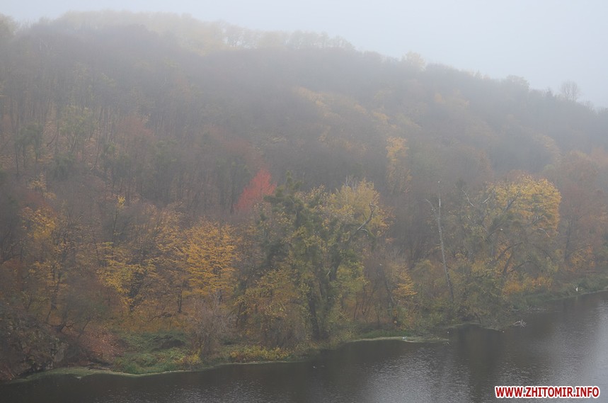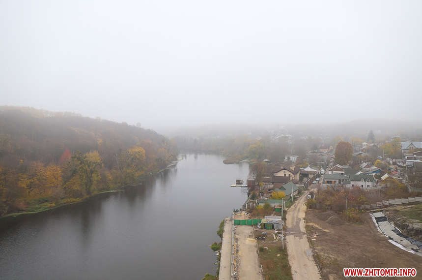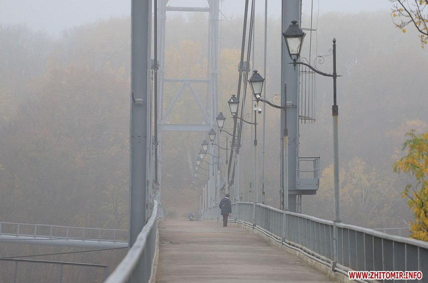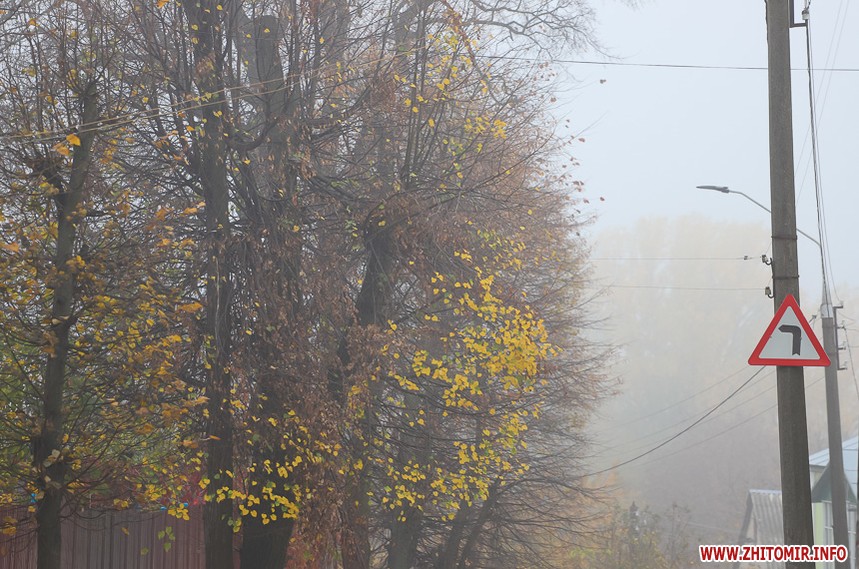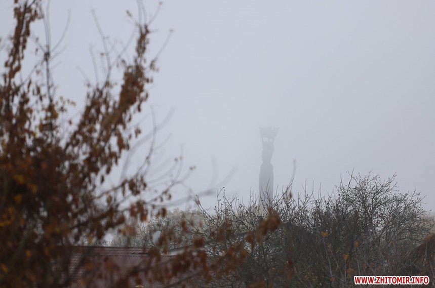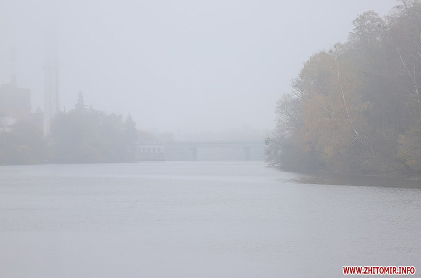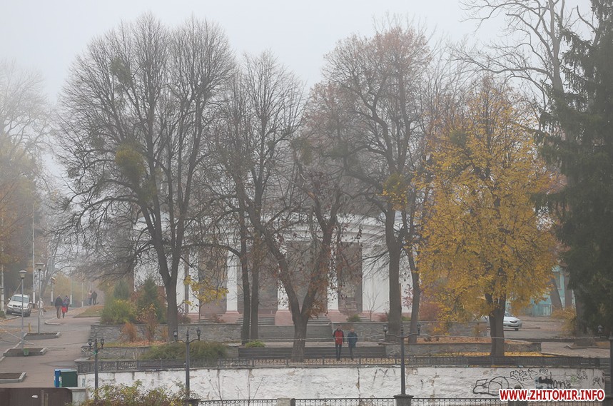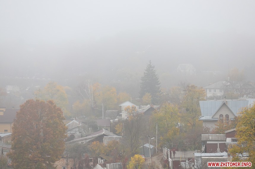 21 жовтня Житомир оповив густий туман, який часто виникає восени через збільшення вологості у повітрі. На вулиці вогко і мрячно, але тепло. Погода сприяє приємним осіннім прогулянкам вздовж Кам'янки та Тетерева.