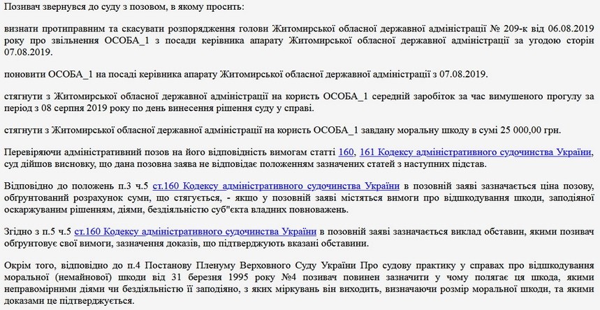 Звільнений керівник апарату Житомирської облдержадміністрації Олексій Шатило хоче поновитися на посаді та отримати середню зарплату за час вимушеного прогулу.