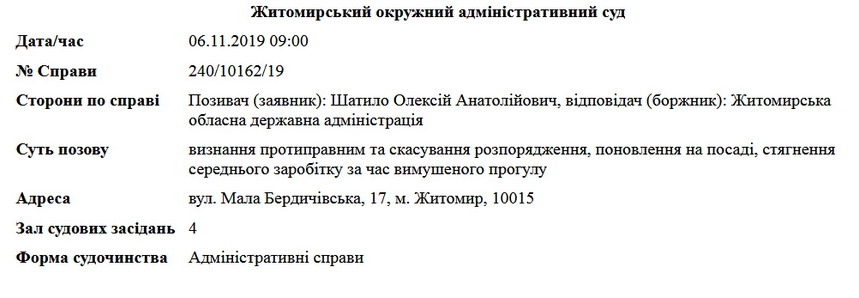 12 вересня на адресу суду надійшла заява позивача про відмову від позовних вимог щодо стягнення моральної шкоди у розмірі 25 тис. грн і ухвалою від 17 вересня Житомирський окружний адміністративний суд відкрив провадження у справі за позовом Олексія Шатила до Житомирської ОДА, чергове засідання призначене на 6 листопада 2019 року.