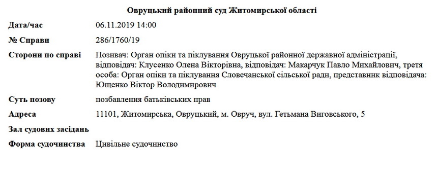 Водночас в Овруцькому райсуді з червня 2019 року розглядається за позовом органа опіки та піклування Овруцької районної державної адміністрації про позбавлення батьківських прав Клусенко Олени Вікторівни та Макарчука Павла Михайловича – батьків загиблої Даринки Макарчук. Ухвалою від 21 серпня суд закрив підготовче провадження у справі, чергове засідання призначене на 6 листопада.