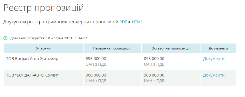 Про це йдеться в закупівлі, опублікованій 4 листопада на ресурсі ProZorro. Участь у відкритих торгах взяло дві фірми: ТОВ «Богдан-Авто Житомир» з ціновою пропозицією у 895 тис. грн та ТОВ «Богдан-Авто Суми» з ціновою пропозицією у 900 тис. грн.