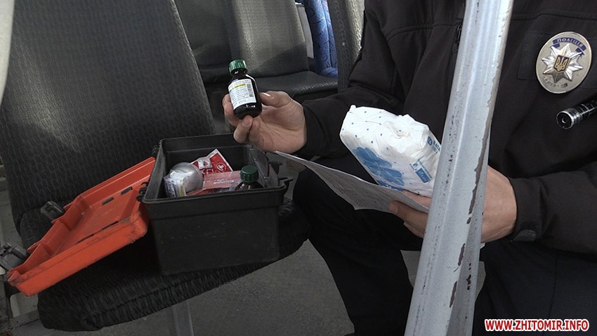 «У всіх автобусах кількістю перевезення до 40 осіб повинна бути аптечка серії АМА-2, передбачена ДСТУ-3649 2010 року. Основні елементи: джгути, перекис водню, валер’яна, новокаїн, лідокаїн та інші елементи, які входять у перечень цієї аптечки», – зазначив інспектор відділу безпеки дорожнього руху патрульної поліції Житомирської області Ігор Кравчук.