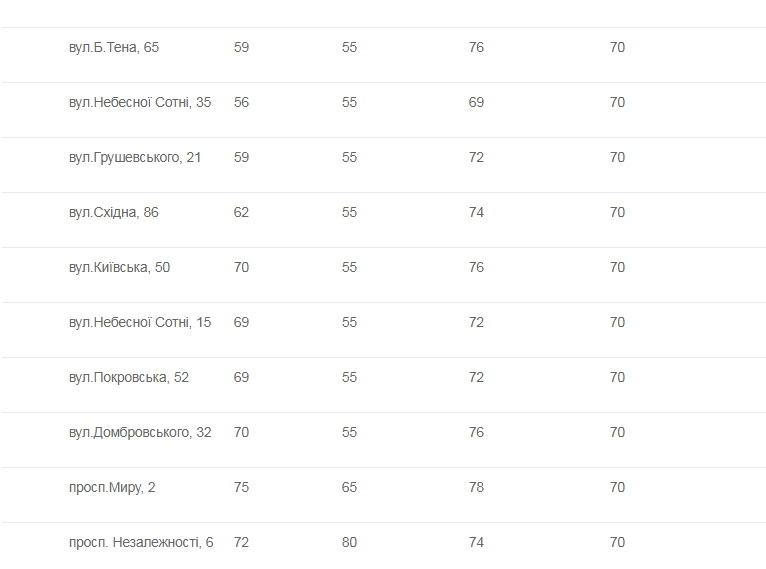 Також на рівень шуму перевірили житлову зону Житомира та за 12 адресами виявили перевищення рівнів еквівалентних та допустимих шумів. Найвищим рівень дБА (акустичних децибелів) виявився за адресою проспект Миру, 2 (78 дБА при максимально допустимому 70 дБА), та за трьома іншими адресами - Бориса Тена, 62, Київська, 50 та Покровська, 2/19 – 76 дБА при максимумі в 70 дБА: