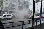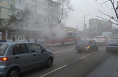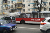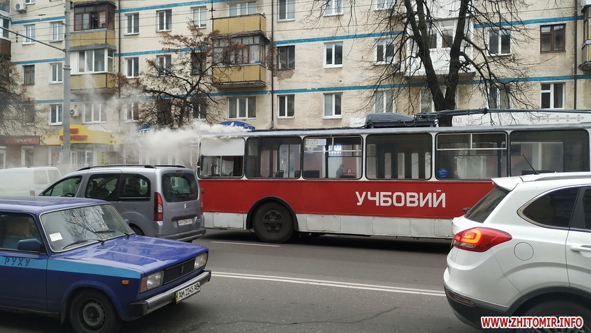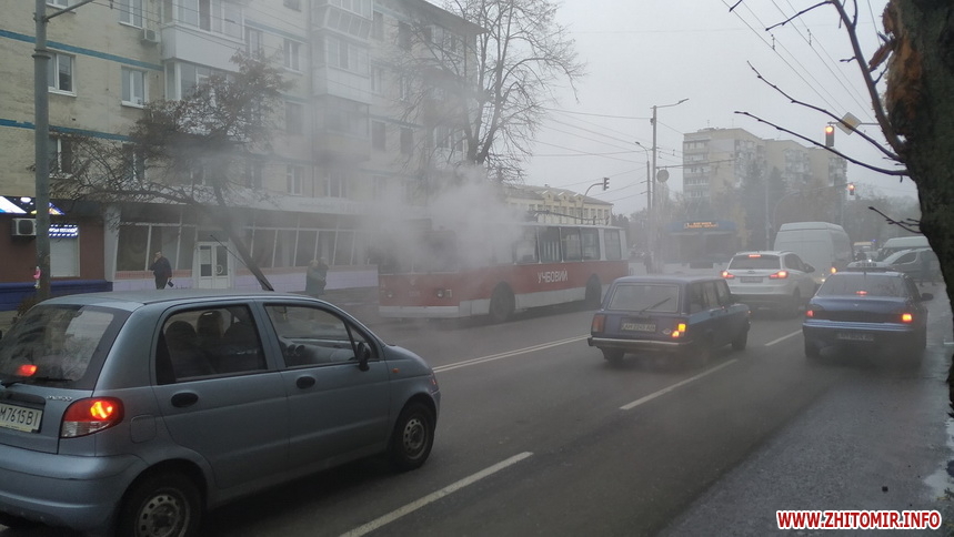 У Житомирі 8 листопада за перехрестям вулиць Київської та Хлібної, неподалік школи №17, задимівся тролейбус. Димом охоплена передня частина транспортного засобу, де сидить водій.