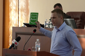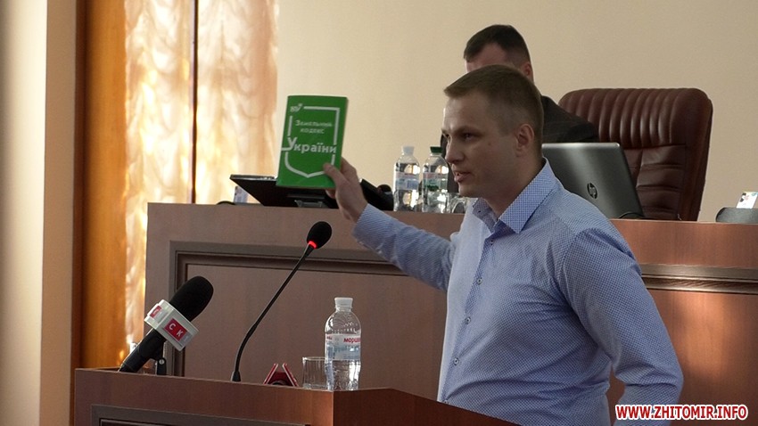 «Я є потерпілим по одному кримінальному провадженню, у якому фігурують працівники нашого Держгеокадастру. Цю книжечку «Земельний кодекс України» я вже п'ять років ношу з собою. Чому? Тому що не виконується земельний кодекс в частині ст. № 122 та № 123, де чітко написано, хто і як має розпоряджатися нашими землями. Підробка документів, перевищення повноважень і службова недбалість — це все присутнє у нашому житомирському геокадастрі, районному й у всіх районах. Тому хочу звернутися до вас, Віталій Іванович (Бунечко, голова Житомирської ОДА, — ред.) з пропозицією: давайте, поки центральний орган буде реагувати, ініціюємо на Житомирщині аудит діяльності цього токсичного органу», – говорить приватний підприємець Олександр Міщенко.