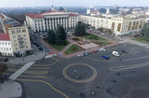 Нині за новою схемою транспорт має рухатися по зменшеному колу, яке змістили ближче до драмтеатру імені Івана Кочерги. Завдяки цьому звільняється місце, де можна буде облаштувати громадській простір.