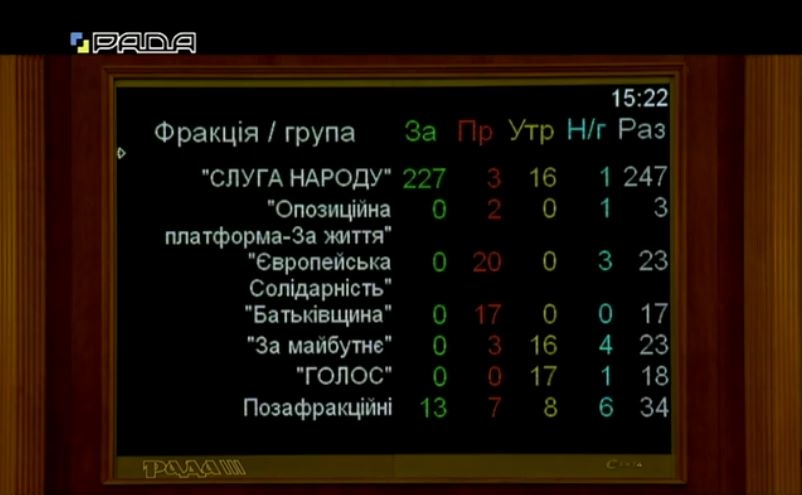 Законопроєкт у першому читанні підтримали 240 народних депутатів: 227 голосів дала фракція партії «Слуга народу», 13 голосів – позафракційні.