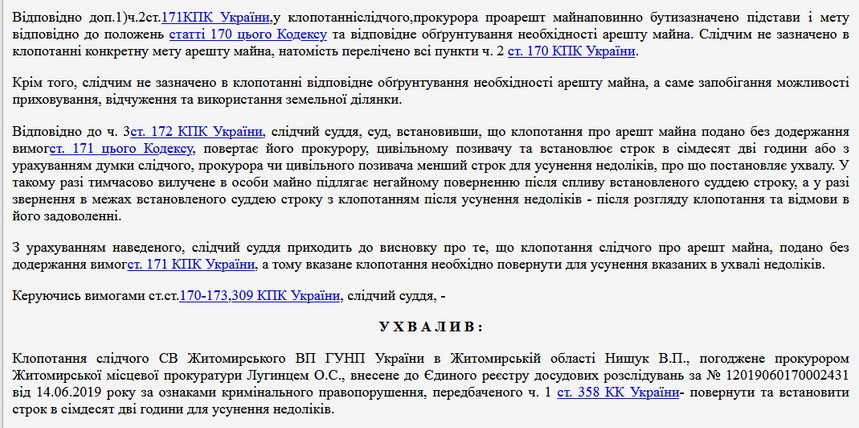 Зазначимо, що 11 листопада Богунський районний суд м.Житомира вже розглядав клопотання слідчого Житомирського відділу поліції про арешт земельної ділянки на проспекті Незалежності, 29, але повернув його для усунення недоліків.