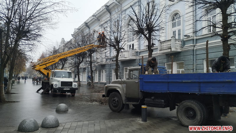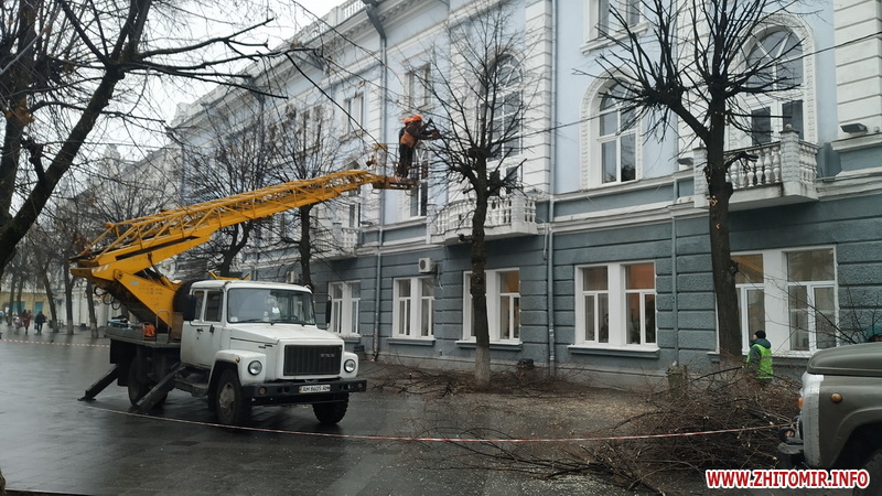 По обіді 20 листопада на пішохідній вулиці Михайлівській у Житомирі комунальники почали кронувати дерева. Липи, що ростуть обабіч вулиці, обрізають за допомогою спецтехніки, гілля складають на вантажівку. Територію біля дерев задля безпеки пішоходів огородили біло-червоною стрічкою.