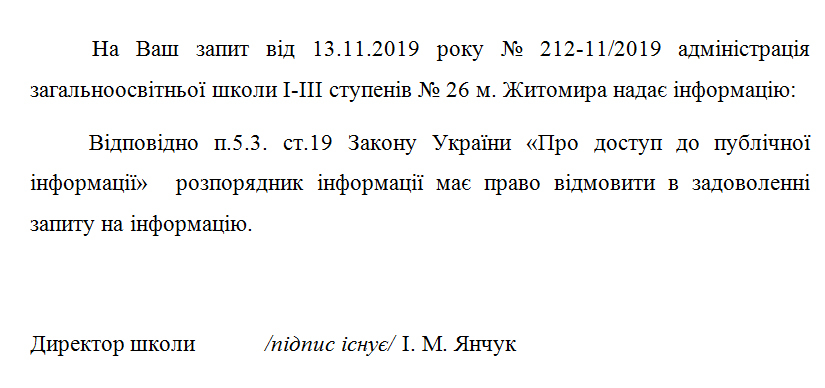 Житомир.info відправив 15 інформаційних запитів до навчальних закладів (школи №27, №14, №16, №21, № 20, №6, №33, №22, №30, №7, №26, ліцей №24, гімназія №3, ліцей №25, гімназія №23) з проханням надати інформацію про те, за якими критеріями обиралися постачальники дидактичних матеріалів та мультимедійного обладнання для НУШ в 2019 році та чи розглядалися конкурентні пропозиції від інших постачальників. Станом на ранок 21 листопада відповіді на інформаційний запит надали 10 освітніх закладів, при цьому школи №26 і №7 відмовилися надавати інформацію, оскільки у запиті (надісланому електронною поштою) не було підпису, хоча закон «Про доступ до публічної інформації» передбачає наявність підпису «за умови подання запиту в письмовій формі».