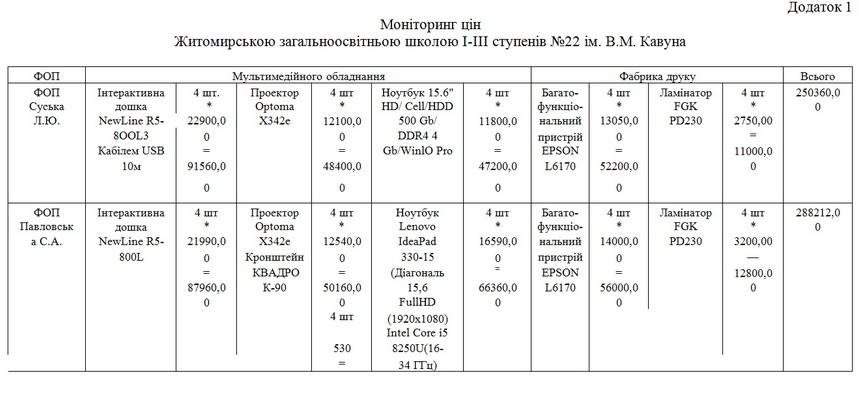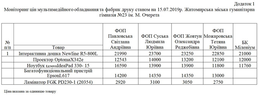 11 із 32 житомирських шкіл закупили проектори, інтерактивні дошки, ноутбуки у ТОВ БК «Міленіум» на загальну суму 1 млн 928 тис. 960 грн.