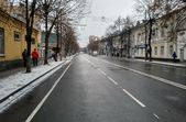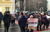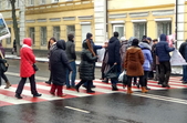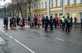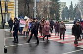 Люди безперервно ходять по пішохідному переходу біля Центру творчості дітей і молоді, що поряд з майданом Корольова. У руках вони тримають плакати «Ми проти забудови АЗС».