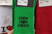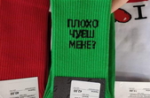 На утеплених подовжених шкарпетках зеленого кольору містяться фрази українським суржиком «Вийди отсюда, розбійник» та «Плохо чуєш мене?», якими глава держави в липні 2019 року вигнав з наради секретаря міськради Борисполя Ярослава Годунка.