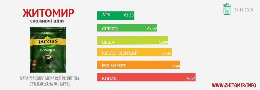 МОНІТОРИНГ ЗДІЙСНЕНО МЕТОДОМ КОНТРОЛЬНОЇ ЗАКУПІВЛІ, У МІСЦЯХ ПРОДАЖУ: AТБ, пр. Миру, 15 А, Ринок "Житній", майдан Житній ринок, Вопак, вул. Київська, 87,ЕКО-маркет, вул. Мала Бердичівська, 2/7, Billa, пр. Миру, 15,Сільпо, майдан Житній ринок, 1