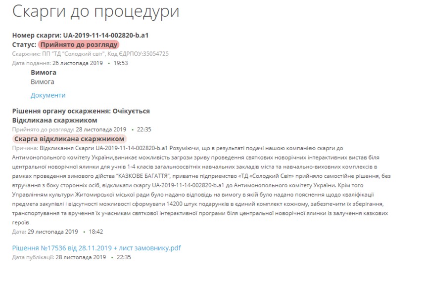 26 листопада вінницька фірма поскаржилась до АМКУ про те, що закупівля послуг з проведення свята та включений до технічних вимог дарунковий фонд, а саме «Солодкий новорічний подарунок» у кількості 14,2 тис. упаковок, - це різні речі, мають різні класифікатори, а тому повинні закуповуватися за двома окремими закупівлями.