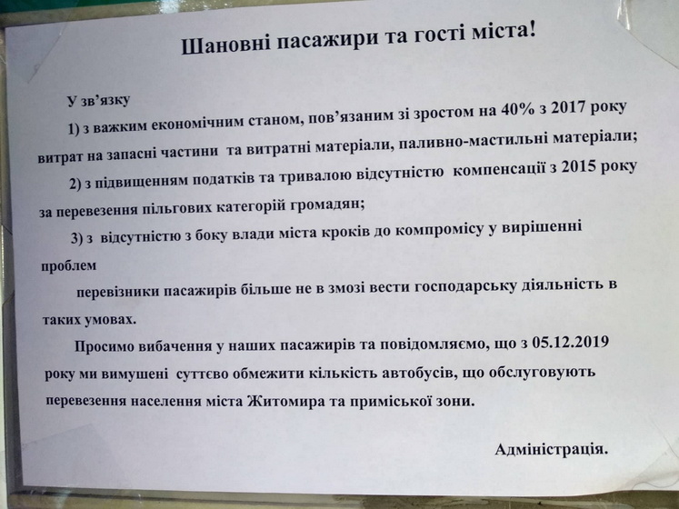 Житомирські перевізники 4 грудня розмістили в маршрутках оголошення про те, що вони «більше не в змозі вести господарську діяльність в таких умовах» і з 5 грудня 2019 року суттєво обмежать кількість автобусів на міських та приміських маршрутах.