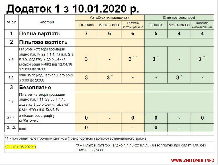 Пропонується з 10 січня 2020 року встановити вартість проїзду в маршрутних автобусах, в тому числі комунальних: готівкою – 7 грн, безготівково чи «Карткою житомирянина» - 6 грн. Для пенсіонерів зберігається пільговий час в маршрутках з 10:00 до 16:00, оплата готівкою становитиме 3 грн, «Карткою житомирянина» - безкоштовно без обмежень у часі. Для учнів на період навчального року з 6:00 до 20:00 вартість проїзду в міських автобусах – 3 грн.