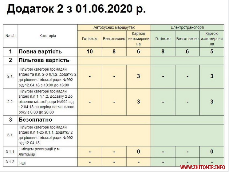 Вартість проїзду в трамваях та тролейбусах при розрахунках готівкою становитиме 5 грн, безготівково – 4 грн. Пенсіонери будуть їздити в електротранспорті безкоштовно до 1 березня 2020 року, а потім безкоштовний проїзд буде лише за «Карткою житомирянина», без неї доведеться платити 3 грн.